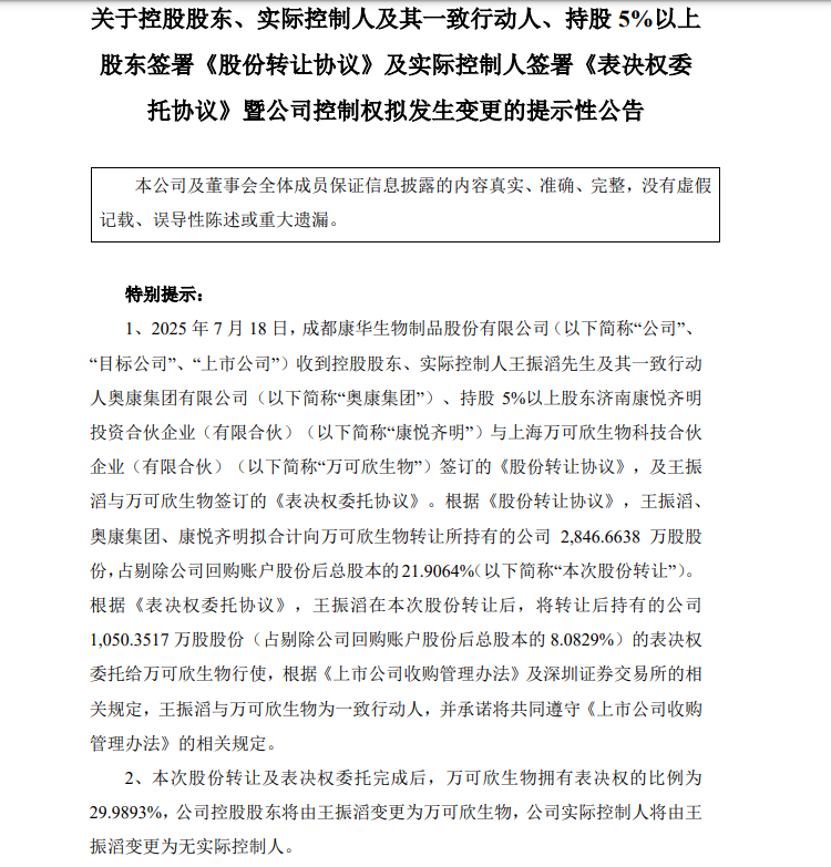 同日,康华生物实际控制人王振滔与万可欣生物签署了《表决权委托协议》。上述股份转让后,王振滔将剩余所持公司8.08%股份的表决权、提名和提案权等委托给万可欣生物行使。实施后,万可欣生物拥有公司表决权的比例为29.99%,康华生物控股股东将由王振滔变更为万可欣生物,因万可欣生物无实控人,公司实控人将由王振滔变更为无实控人。公司股票于7月21日复牌。