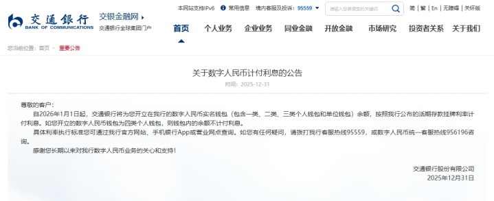 交通银行称,自2026年1月1日起,交通银行将为您开立在我行的数字人民币实名钱包(包含一类、二类、三类个人钱包和单位钱包)余额,按照该行公布的活期存款挂牌利率计付利息。如您开立的数字人民币钱包为四类个人钱包,则钱包内的余额不计付利息。