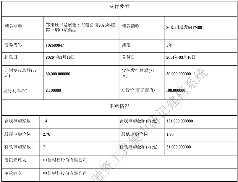 3月16日,郑州城市发展集团有限公司2026年度第一期中期票据发行情况出炉。郑州城市发展集团3亿元中期票据完成发行,利率2.1%,期限5年。主承销商为中信银行,起息日为2026年3月16日,兑付日为2031年3月16日。募集资金拟将全部用于偿还到期中期票据部分本金。