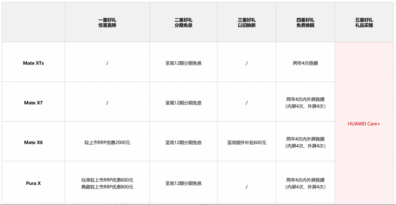 再看华为 Pura X,从 2025 年 12 月 20 日 0 时起,大家购买这款手机至高可享 800 元优惠,结束时间以门店 / 店铺通知时间为准。不同机型优惠不同,详情请咨询门店或查看电商销售页面。还有免费换膜活动。华为 Mate X7、Mate X6、Pura X 购机 2 年内,可享内外屏各 4 次免费贴膜;Mate XTs 购机 2 年内,可享 4 次屏幕免费贴膜;中国大陆地区华为授权服务中心均可参与,权益详情请咨询店员。